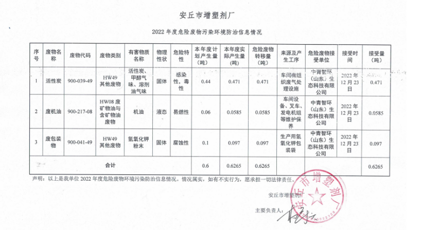 2022年度危險(xiǎn)廢物污染環(huán)境防治信息情況公示